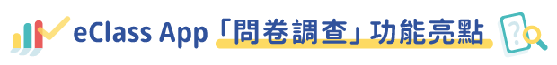 eClass App 的「問卷調查」功能可以讓教職員、學生及家長隨時隨地透過手機輕鬆表達各自寶貴的意見,以更方便的形式參與學校的各項建設性議題,共同為校園的未來發展貢獻力量。